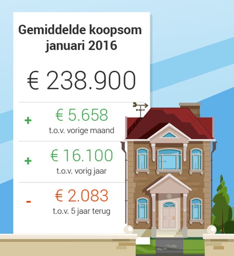 De huizenprijzen per januari 2016 liggen 6,1% hoger dan januari 2015. En er zijn 26,2% meer huizen verkocht dan dezelfde maand vorig jaar. De huizenmarkt staat in bloei. Goed nieuws voor de mensen met een eigen huis die inmiddels weer kunnen verhuizen, zonder spaargeld in te hoeven zetten voor het aflossen van een restschuld. Omgekeerd zien starters de woonlasten nu snel stijgen.