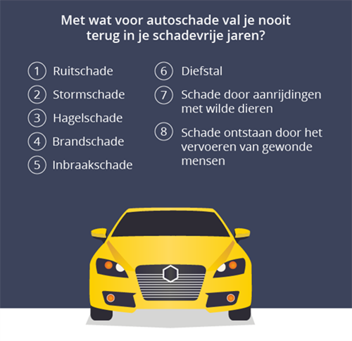 De schade-oorzaken waarmee je jaren verliest zijn ook voor elke autoverzekering hetzelfde geworden. Dat betekent bijvoorbeeld dat het vervangen van je voorruit geen invloed heeft op je schadevrije jaren. Net zo min als storm- en hagelschade, of  bij inbraak of diefstal.
