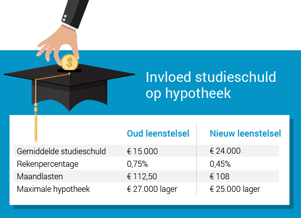 Als afgestudeerde heb je gemiddeld € 15.000 studieschuld. Je maandelijkse aflossing is dan € 112,50 (0,0075 * € 15.000). Dit bedrag wordt bij de berekening van de maximale hypotheek van je inkomen afgehaald. Je hypotheek valt hierdoor € 27.000 lager uit.