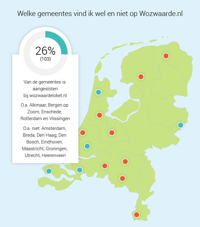 Nederland telt 390 gemeenten. Van slechts een kwart zijn de woningen te vinden op Wozwaardeloket.nl. Wie naar de lijst met aangesloten gemeenten kijkt, ziet dat veel grote steden het vooralsnog af laten weten. Zo kun je als inwoner van Amsterdam of Utrecht nog geen gegevens over de WOZ-waarde vinden. Rotterdam staat er wel tussen. Bekijk in de volledige en actuele lijst of jouw gemeente al WOZ-gegevens openbaar heeft gemaakt.