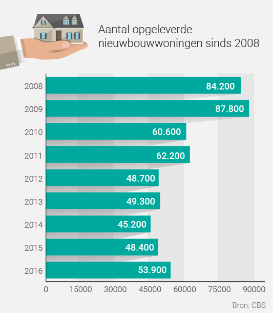 De nieuwbouw komt ook langzaam weer op gang. Is het genoeg? Zeker niet. Het CBS schreef dat in 2016 het hoogste aantal nieuwbouwwoningen opgeleverd is in vijf jaar tijd: 53.900. Dat aantal kan nog wat oplopen, nog niet alle respons is binnen bij de statistici. Dat klinkt euforisch, maar dat is het niet.