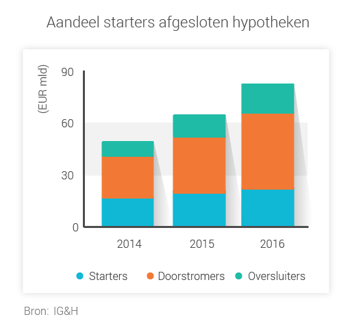Volgens de bank zijn het voornamelijk doorstromers die jubelen over de woningmarkt. Hun huizen zijn meer waard en hun kooplust is groot. Starters zonder eigen huis verliezen echter het enthousiasme. De prijzen zijn hoog en ze komen er moeilijk tussen. De bank signaleert een kleiner aandeel van starters in het aantal gesloten hypotheken. Een teken dat koophuizen aantrekkingskracht inleveren.