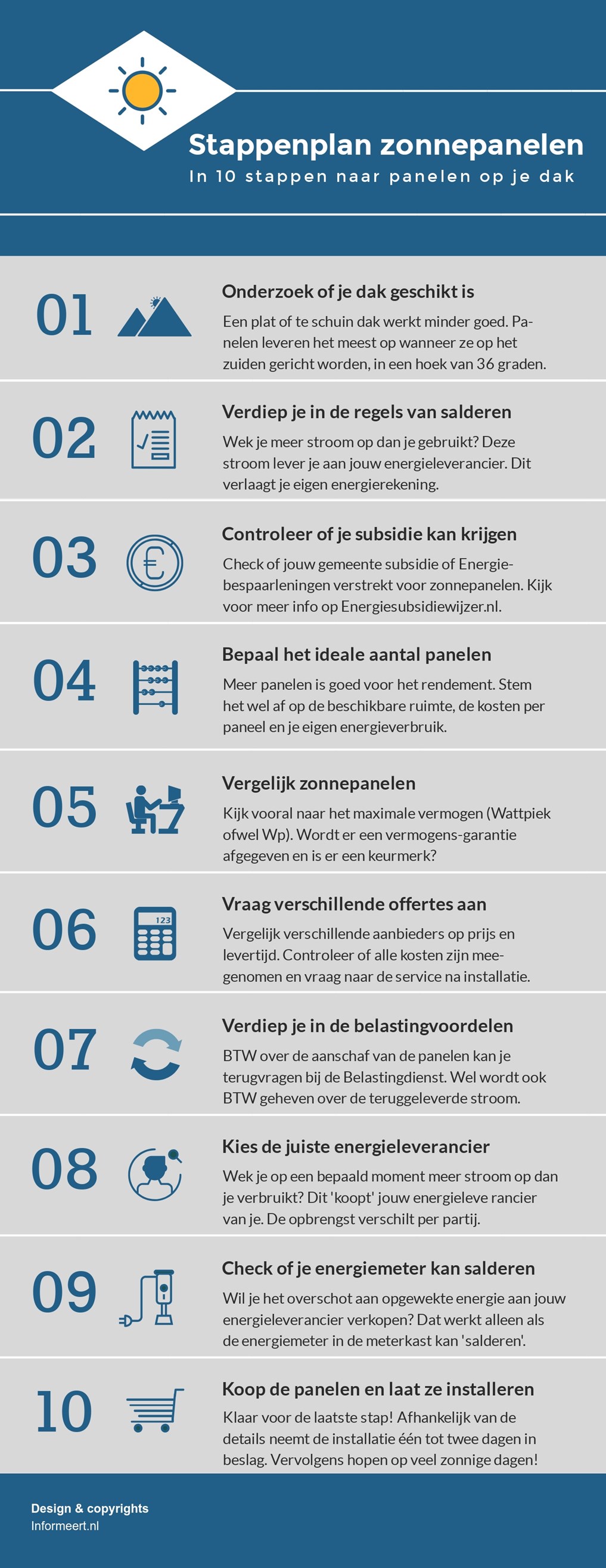 Het opwekken van stroom met zon, water of wind is niet het specialisme van Rovers & Van Hoof Assurantiën I Hypotheken. Vraag ons dan ook niet welk soort paneel jij het best op je dak kan leggen of wat de exacte opbrengst is van een bepaald type. Wel helpen we je graag op weg met de onderstaande infographic. Met het stappenplan bepaal je of de installatie van zonnepanelen iets voor jou is en hoe het aan te pakken.