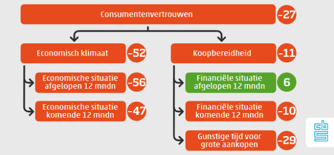 Het vertrouwen van consumenten komt in juni uit op -27, wat iets hoger ligt dat de -31 in mei. Een stand onder de nul geeft aan dat er meer mensen somber zijn dan positief over de economie en hun financiële situatie. In januari 2020 stond de teller 36 in de plus, de hoogste stand ooit. Het dieptepunt is in deze coronacrisis nog niet bereikt. Die stamt uit maart 2013 (-41). Vooralsnog had de woning- en bankencrisis destijds dus meer effect op het vertrouwen.