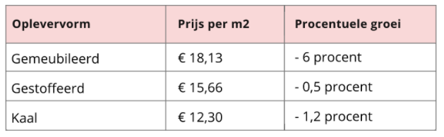 Huur je een volledig gemeubileerde woning, dan maak je minder kosten voor het inrichten van je nieuwe thuis. Wel zie je dit terug in de gemiddelde huurprijs. Die ligt hoger dan bij het huren van een kaal opgeleverde woning. Gestoffeerd is een tussenvariant. De huur van alle varianten is in de afgelopen kwartalen gedaald, al leverde de gemeubileerde vorm het grootste percentuele voordeel op.
