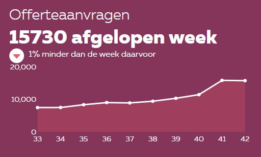 Hypotheken Data Netwerk (HDN) registreert de offerteaanvragen voor hypotheken bij alle grote geldverstrekkers in Nederland. Sinds de stijging van de hypotheekrente is er een forse stijging te zien. Vorige week (van maandag 18 t/m zondag 24 oktober 2021) lag het aantal aanvragen op 15.730. In de week ervoor ging het om 15.832 aanvragen. Ter vergelijk, half september bleef de teller nog hangen onder de 10.000.