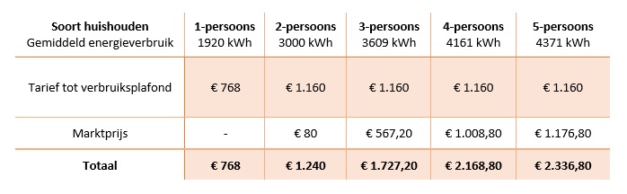 In het oorspronkelijke plan van het kabinet was het verbruiksplafond vastgesteld op 1.200 kuub gas en 2.400 kWh per jaar. Het plafond voor stroom is verhoogd naar 2.900. Daarnaast zijn de maximumtarieven verlaagd voor wie onder dit plafond blijft. Het tarief voor stroom is bijna gehalveerd van € 0,70 naar € 0,40 per kWh. Voor gas ga je € 1,45 betalen, dat is 0,05 cent minder dan eerder gecommuniceerd.