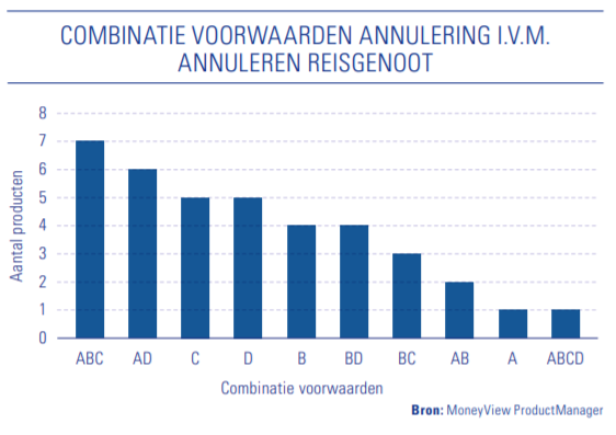 Onderzoeksbureau MoneyView onderzocht de specifieke voorwaarden van reisverzekeringen. Bij alle 43 doorlopende reisverzekeringen is annulering mogelijk bij het afhaken van een reisgenoot. Hier stellen echter maar vijf producten geen beperkende voorwaarden aan. Bij de overige 38 producten worden wel aanvullende voorwaarden gesteld, waaronder: