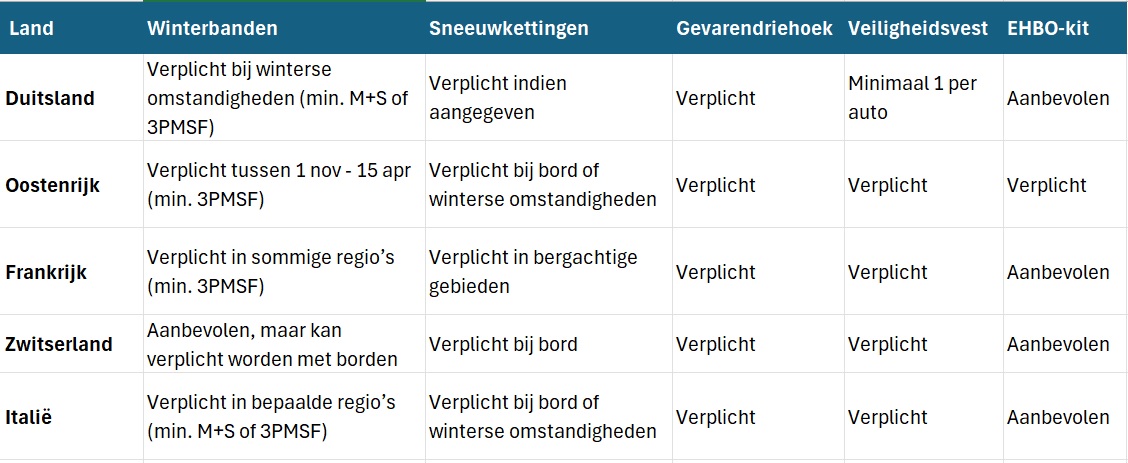Elk wintersportland heeft specifieke eisen voor de uitrusting van je auto. Dit zijn in 2025 de belangrijkste regels voor de populairste bestemmingen: